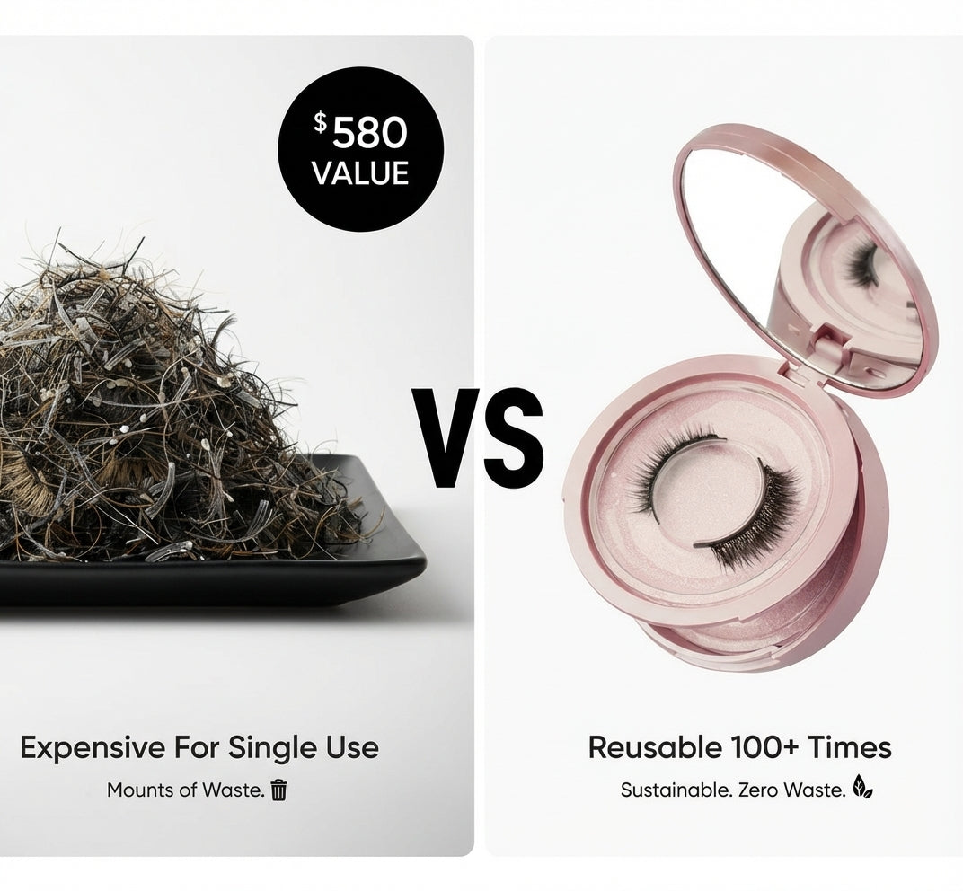Each pair is designed for 100+ wears with proper care — meaning you save $500+ a year compared to salon extensions or single-use falsies. Just clean the bands after each use and store them in the included compact.
